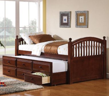 This twin size bed is multifunctional, offering a comfortable place to lounge and read, and a great sleeping spot by night. Three spacious storage drawers below the trundle offer lots of space for clothing and extra linens, so you can make the most of your room. This daybed is available in a cappuccino finish.Features: Traditional StyleCappuccino finishSome assembly required.Dimensions: 80.75″W x 42.75″D x 37.5″H