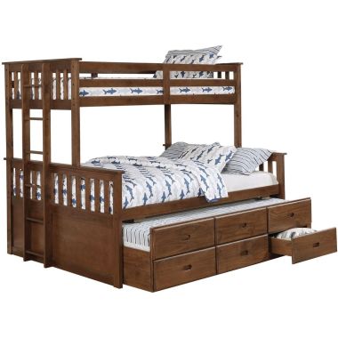 Perfect for those times when you have a full house, this bunk bed offers a variety of comfy sleeping arrangements for your guests. A twin bed up top is ideal for a little one, while a queen bed below allows adults to stretch out comfortably. A built-in trundle is hidden underneath for even more cozy sleep space. Two large storage drawers round out the convenient appeal of this versatile bed. Complete with a beautiful, weathered walnut finish over a sturdy wooden frame, this bed is as fashionable as it is functional.