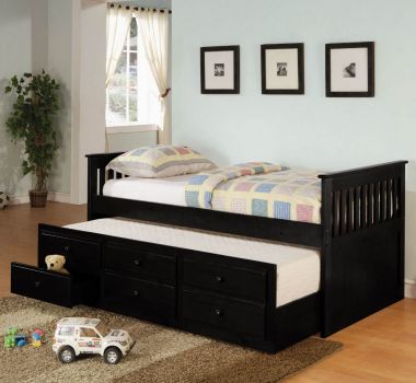 This daybed collection can provide a comfortable place to lounge during the day, and cozy spot to sleep at night. A convenient trundle below allows you to easily accommodate overnight guests, pulling out simply to provide an extra twin size sleeping space. Three spacious storage drawers below the trundle offer lots of space for clothing and extra linens, so you can make the most of your room. Available in black, white, and rich medium cherry finishes.Features: Transitional StyleBlack finishSome assembly required.Dimensions: 80.5″W x 42.5″D x 36.25″H