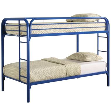 Open up a shared room with the smooth lines in this twin bunk bed. The open, supportive frame creates a modern look with an elongated and balanced silhouette. Constructed of metal, the frame offers a playful blue hue for a youthful take on clean, contemporary design. Built-in ladders on both sides add support. Featuring a full-length guard rail, this twin over twin bed simplifies with sleek features and a fun pop of color.