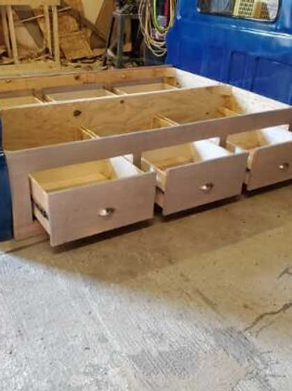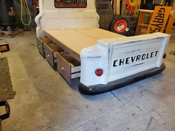 Full Size bed with dresser drawers. This bed comes with 6 wooden drawers perfect for just about anything. This bed is made from fiberglass and wood and it is built to last. The color of this piece is customizable to you.