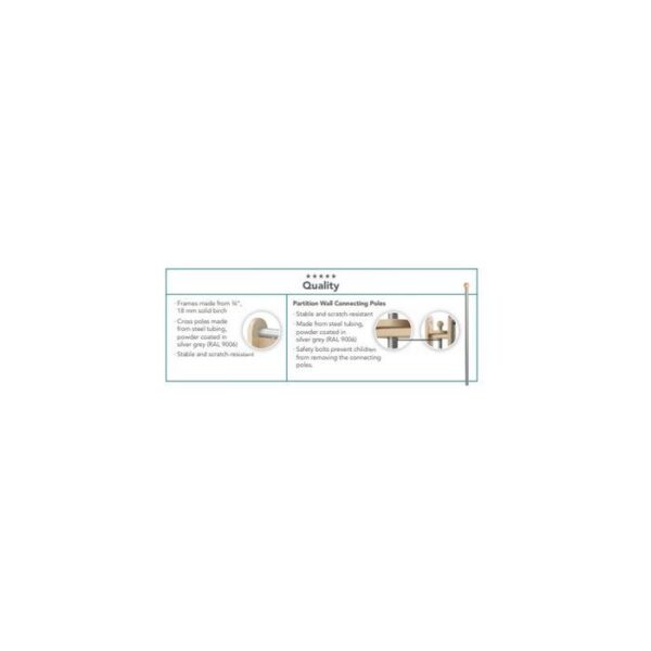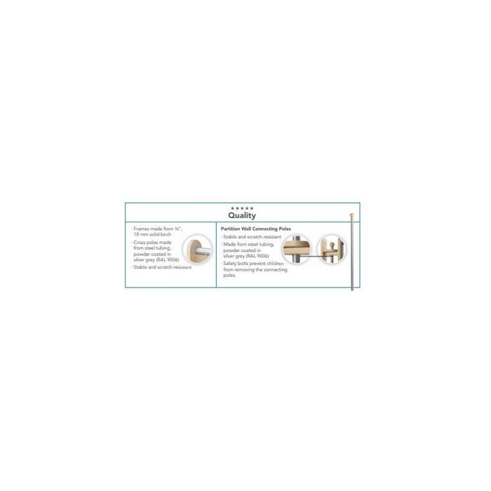 This birch partition is perfect to combine with other panels to create a cozy retreat. Have fun creating different combos of partitions making separate little spaces. Use this to not only divide spaces, but to block out noise and make for a private place for little ones to rest. These areas are perfect for building, reading, collaborating or coloring. The ideal way to divide rooms is partition cabinets with plenty of storage space for play materials. Frame made of beech wood with steel powder coated cross bars.