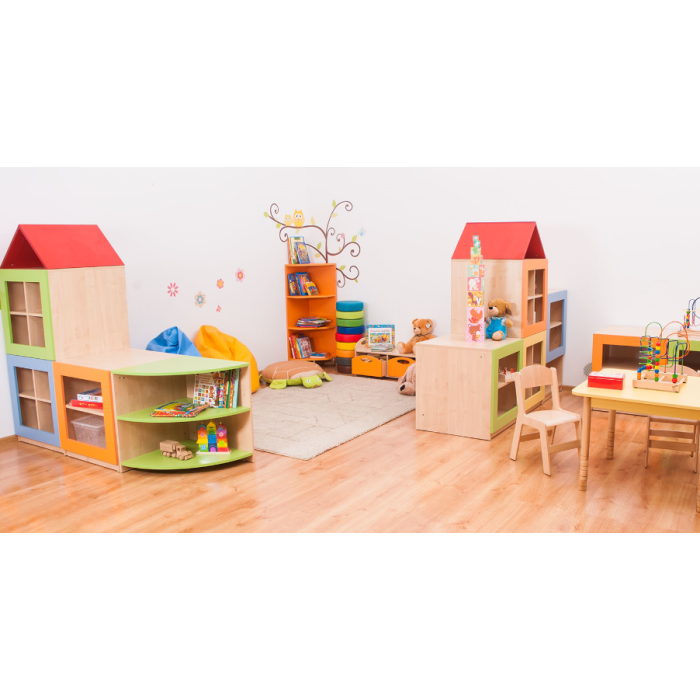 Use this set of furniture to build an interesting and creative play area. It is also useful in separating the space not only in big rooms but also in those smaller ones. Nice, maple body perfectly matches the colorful elements. The height of cabinets is fitted to little ones heights so they can easily use every single shelf. The set is made of laminated chipboard. Together we build a safe world for our children. High quality is our number one priority. We create spaces for kids with passion and commitment.