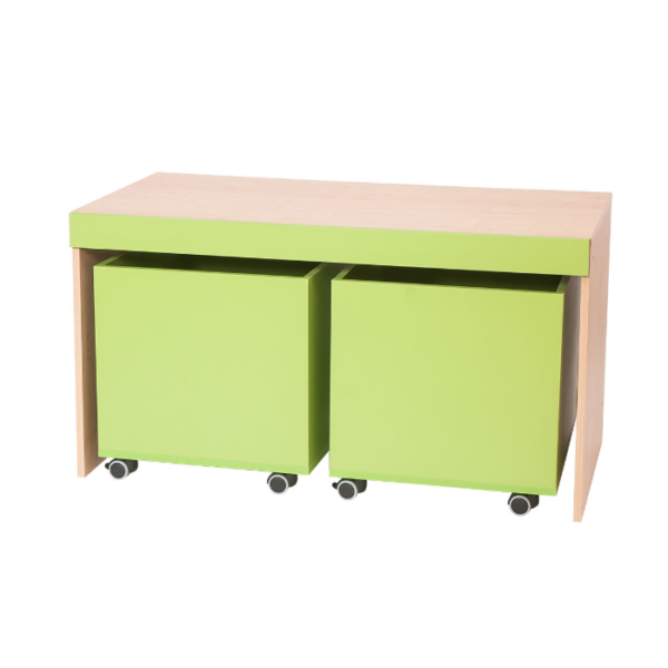 A furniture module that creates a visually interesting element. This wide bench with two rolling storage bins is useful for separating spaces to clearly distinguish zones with each having a different purpose. Easily moves to any space with casters. This colorful bench with storage creates a cozy retreat for reading or telling stories and has its own seats. Use in classrooms, children’s libraries & early learning centers. Frame made of maple-colored laminated chipboard and colored elements are made of laminated MDF board. Bolt to Bolt connection for stability. 2″diameter plastic wheels, simple mounting with stopper. Some assembly is required.