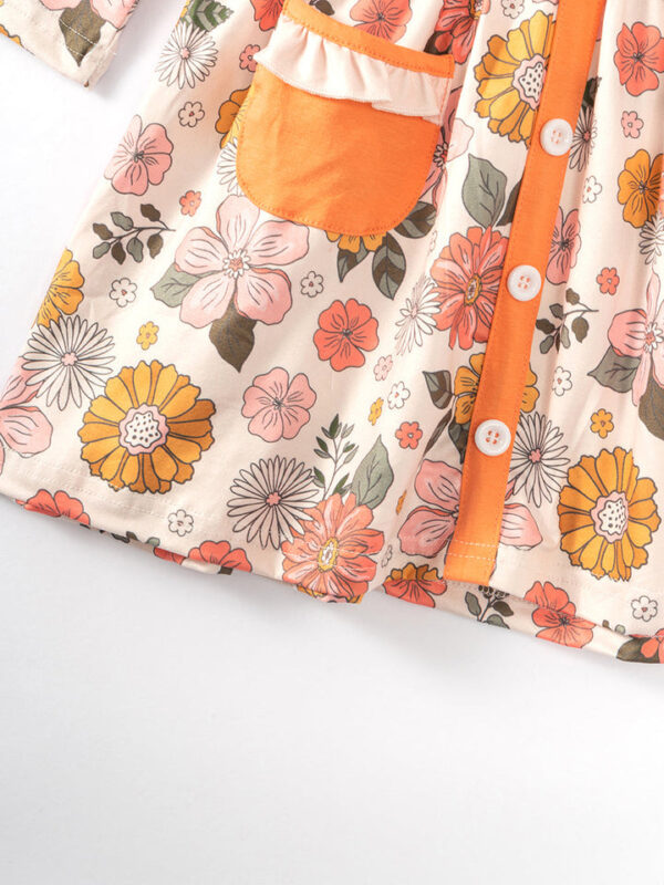 Watch her shine in this oh-so-adorable boutique dress! Featuring a cheerful orange floral print, roomy pockets, and sweet ruffles, she’ll look simply stunning in this dress. Perfect for special occasions or everyday play, there’s no better way to make her day bloom!